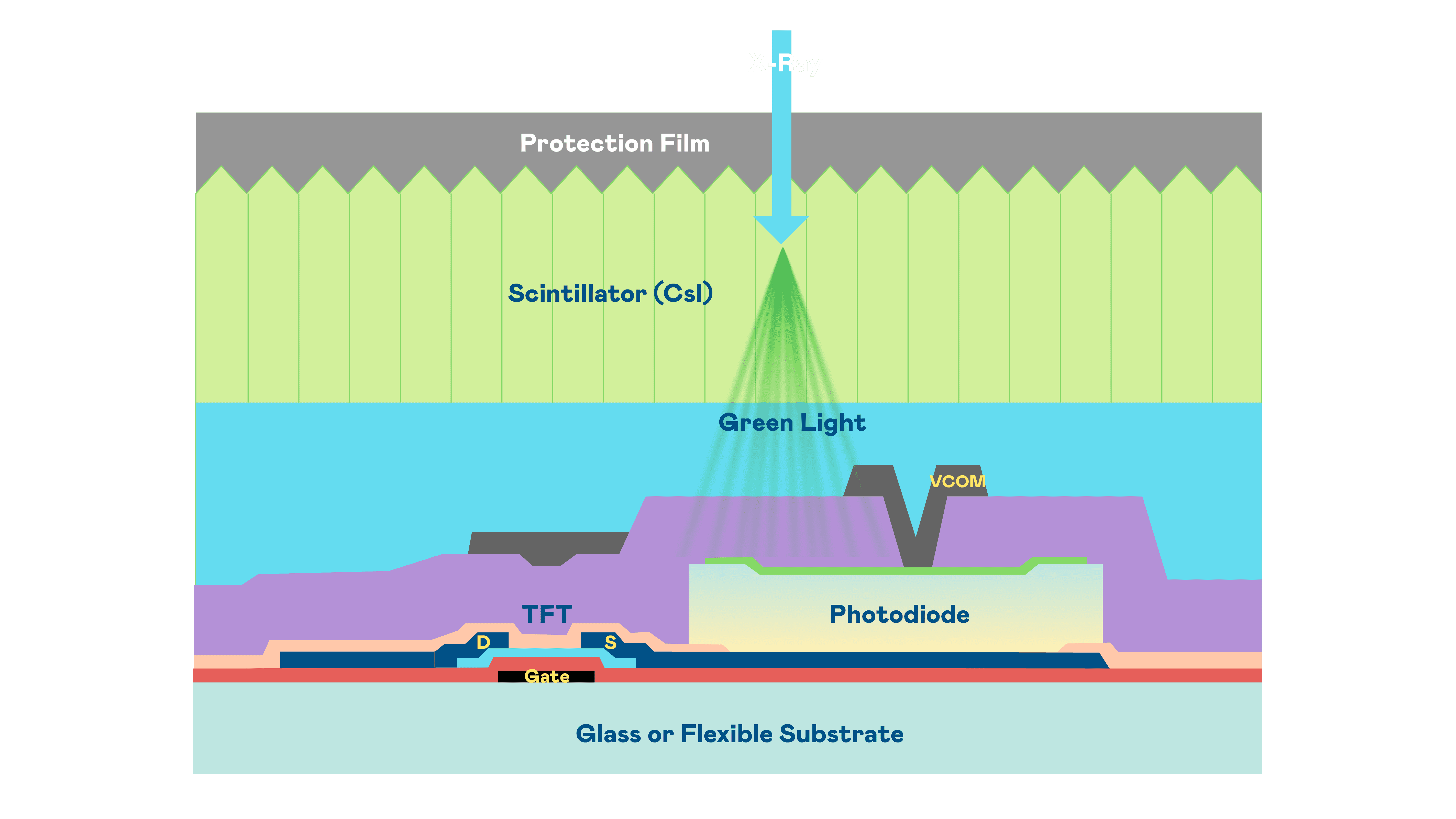 尊龙z6的X光影像感测阵列使用薄膜电晶体 (TFT) 作为每个像素的读取开关,,,搭配光电二极体(Photodiode)的光电转换元件,,,用以感测X光影像讯号。。